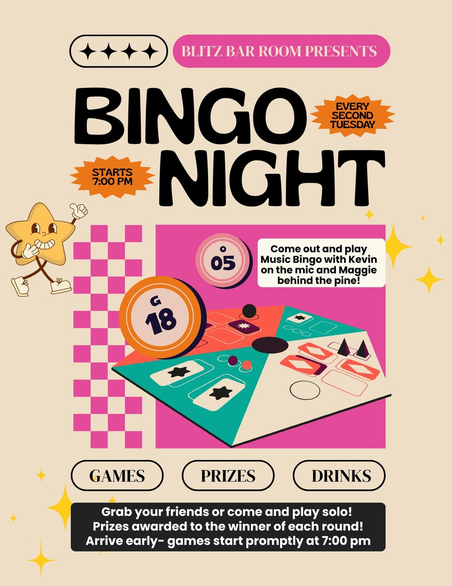 Now, on the second Tuesday of every month, you can come to the Blitz and test your music knowledge with this fun game. Listen to a small clip of various songs and see if you have the correct answer on your bingo board. We have hosted this event before, and it always draws a crowd. You won't want to miss this!