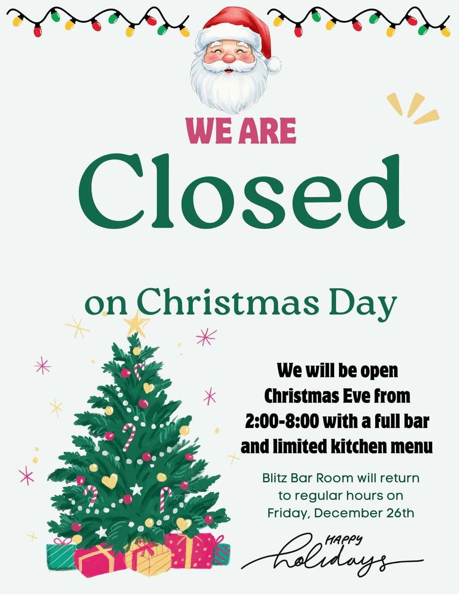 We are closed on Christmas, but open on Christmas Eve from 2pm until 8pm(ish). Stop in before or after your event to warm yourself up with "Christmas Cheer"