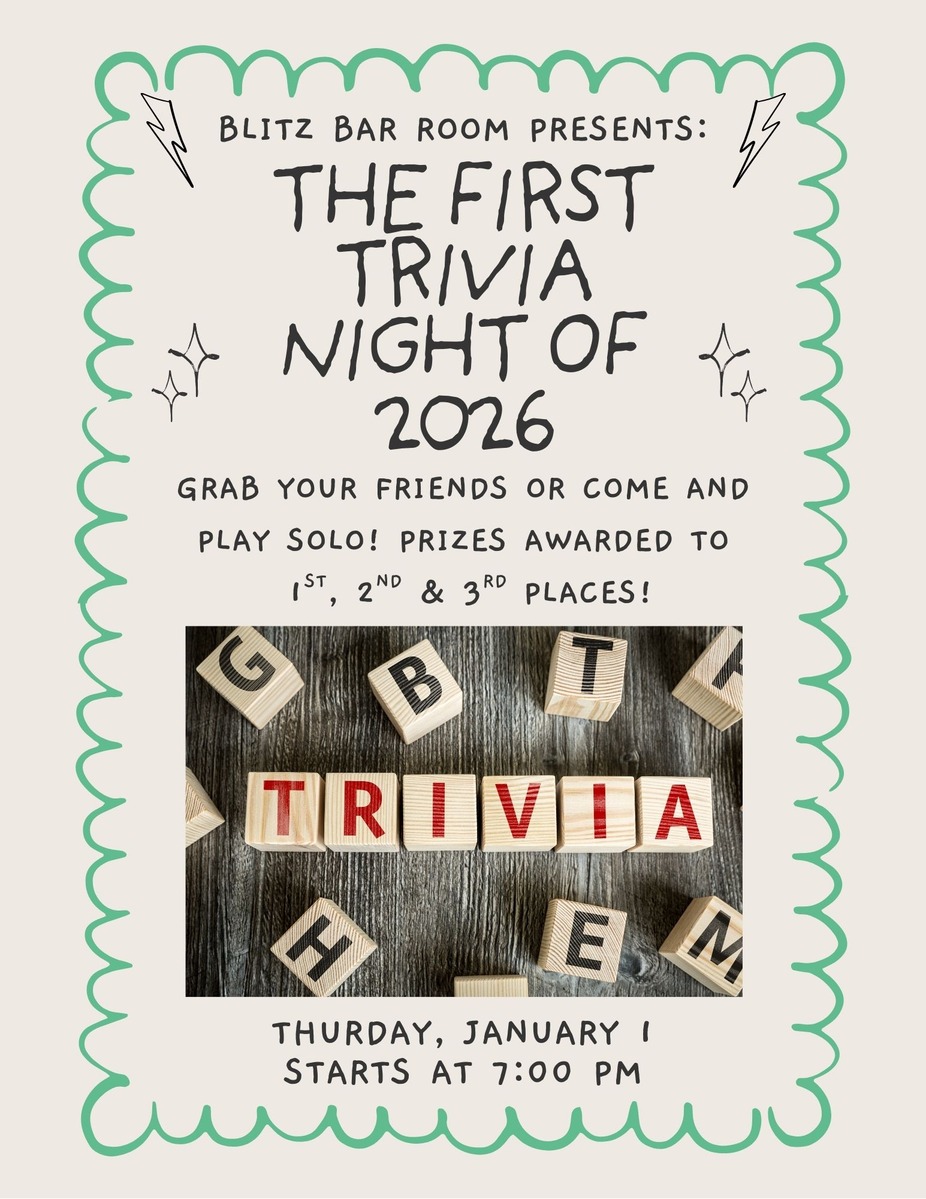Join us for Trivia night at the Blitz Bar Room every Thursday. It's always a great time with DJ Trivia. Play for free and win gift certificates to the bar and great prizes. Do you have what it takes? Play alone, or with a group. Get there early if you want to get a good seat.