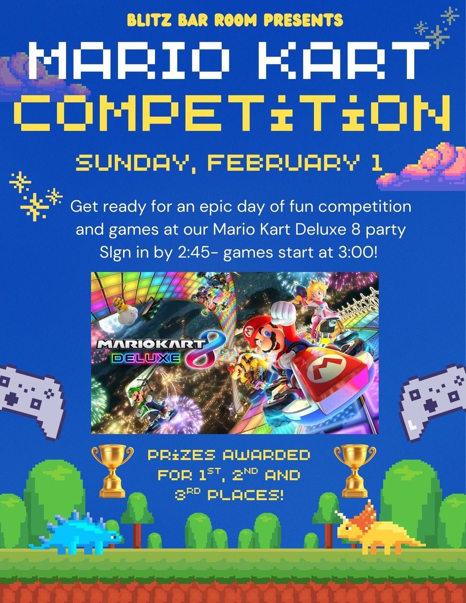 Do you have Mario Kart skills? Prove it! Come into the Blitz Bar Room on Sunday, February 1st, and compete against some of Rochester's best—prizes for 1st, 2nd, and 3rd place drivers. The game will be played on our 160" big screen.
